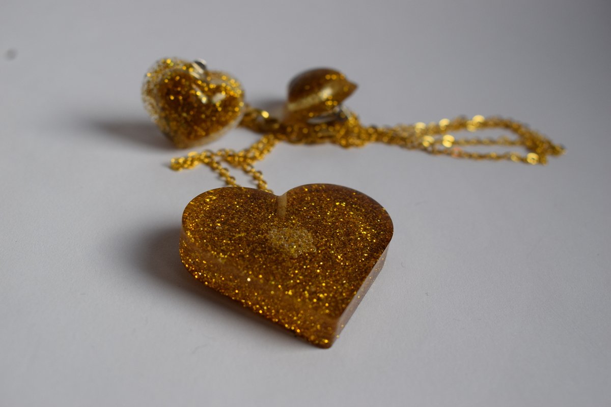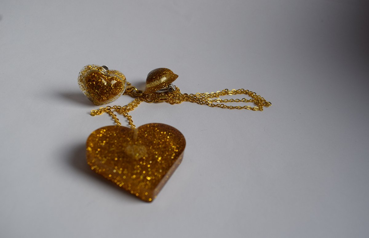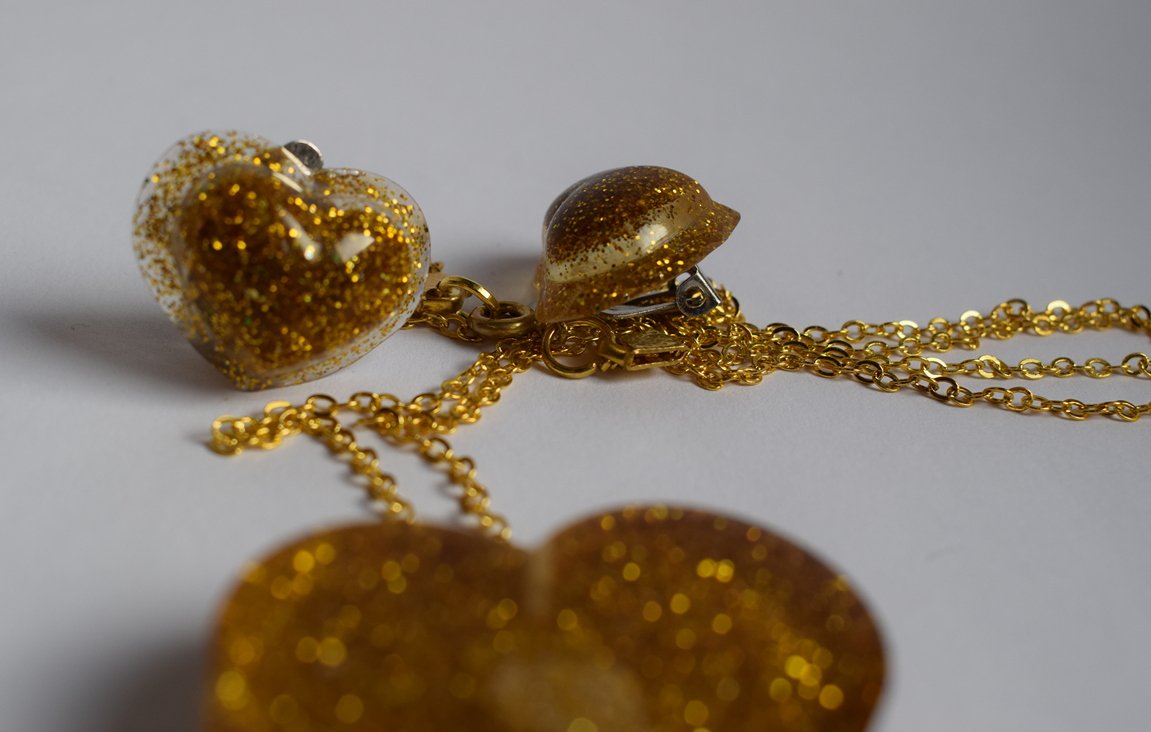 Рачно лиен од проѕирна епоксидна смола со богат златен глитер. Содржи привезок-срце на златест синџир и клип-обетки во ист стил. Полирана „стаклена“ површина, лесен и издржлив – идеален за празничен сјај.
