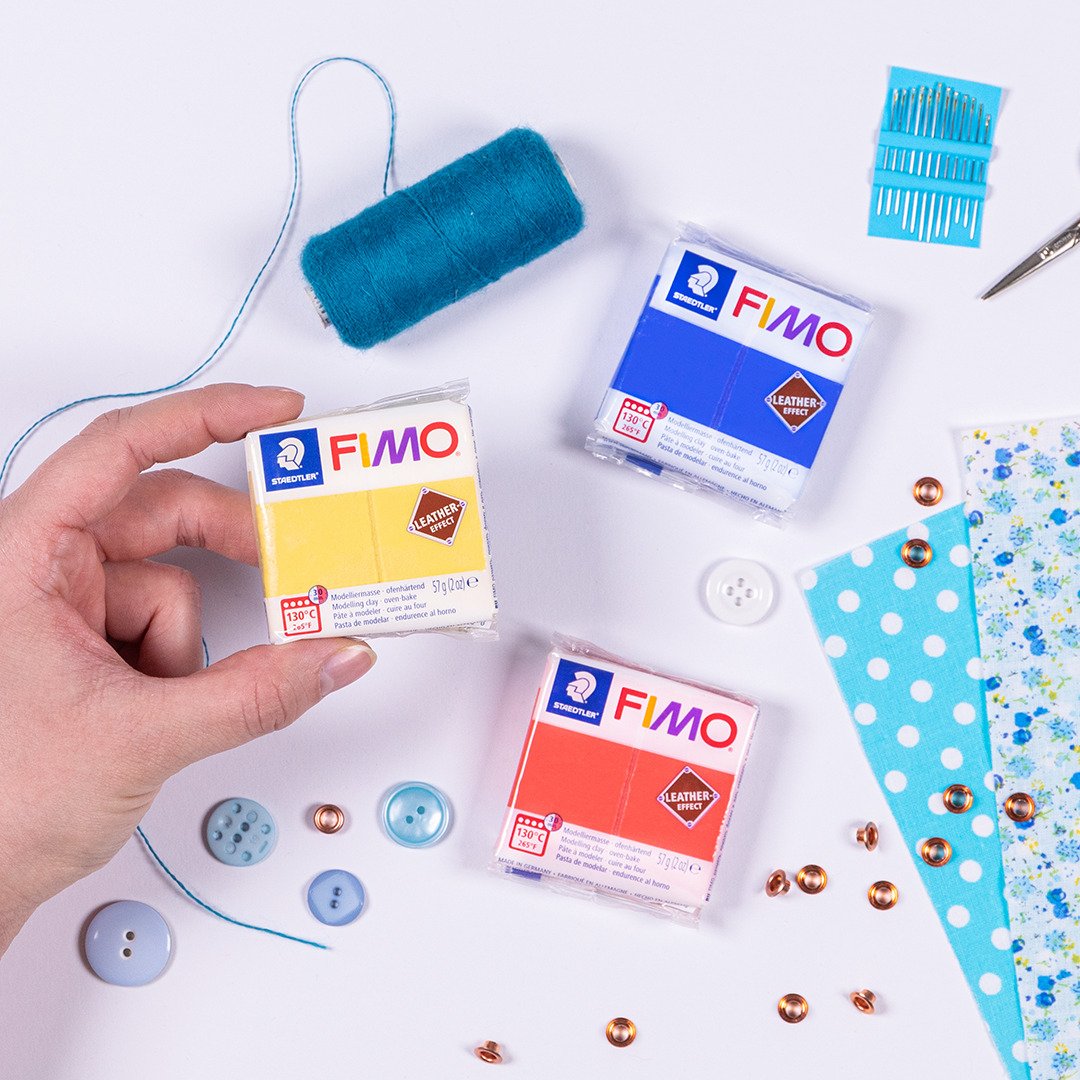 FIMO со ефект на кожа е глина за моделирање што се стврднува во рерната и може да се обликува и обработува на ист начин како и FIMO soft. По стврднувањето изгледа и на допир создава чувство слично на кожа, а ефектот го чувствувате дури и кога го месите. За разлика од другите типови на FIMO кои се стврднуваат во рерната, FIMO кожниот ефект се зацврстува 30 минути на 130 ° C / 266 ° F. По стврднувањето, тенките листови се многу флексибилни и може да се свиткаат, сечат со ножици, да се удираат или сошијат. Оваа глина за моделирање е идеална за изработка на уникатни парчиња накит како што се обетки, ѓердани или нараквици. Исто така можат да се прават прекрасни украси со кожен ефект за вашиот дом.