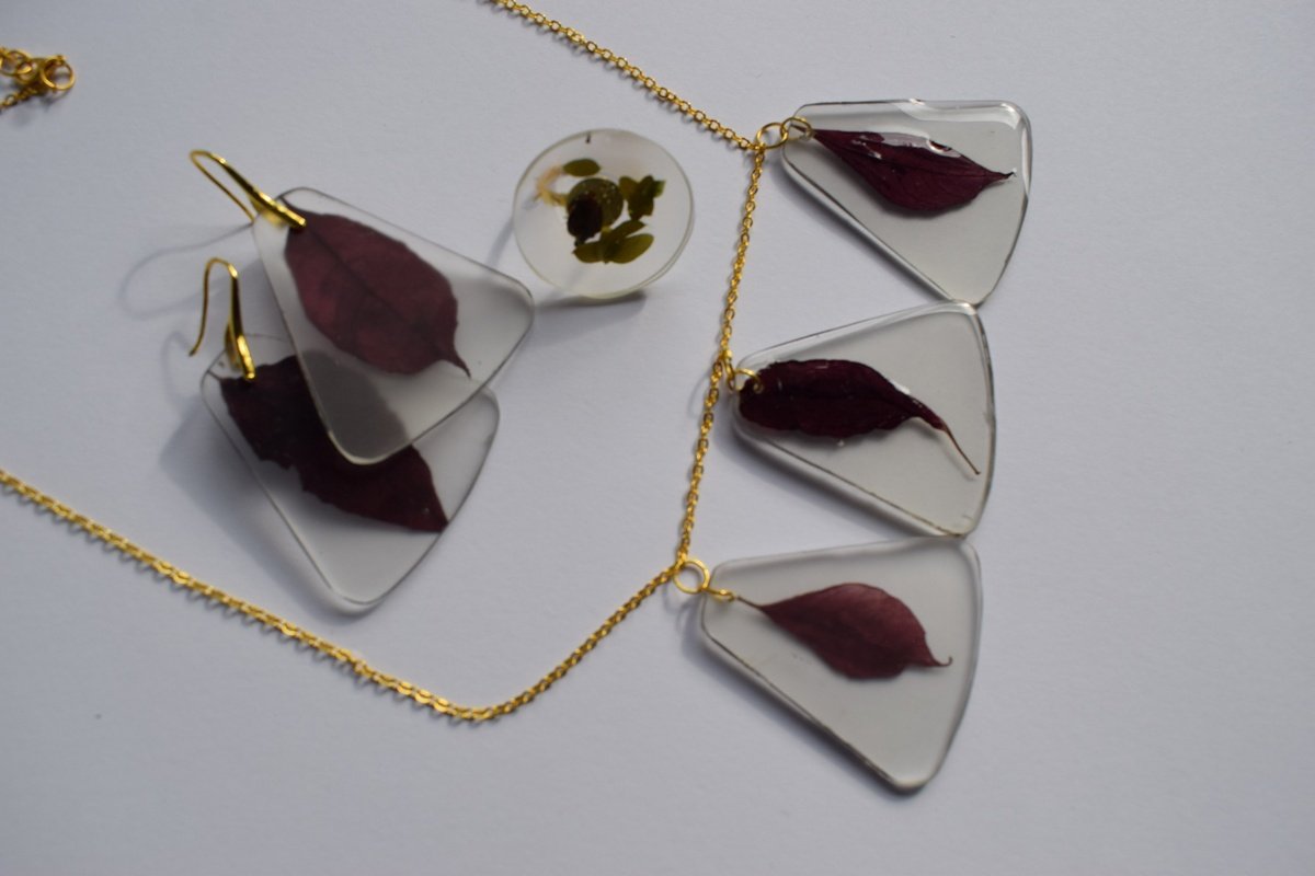 Рачно лиен сет од кристално проѕирна епоксидна смола со вметнати пресувани бордо лисја. Вклучува ланче со три триаголни привезоци на златест синџир, триаголни обетки и прилагодлив прстен. Лесен, издржлив и со стаклест сјај – природно елегантен акцент.