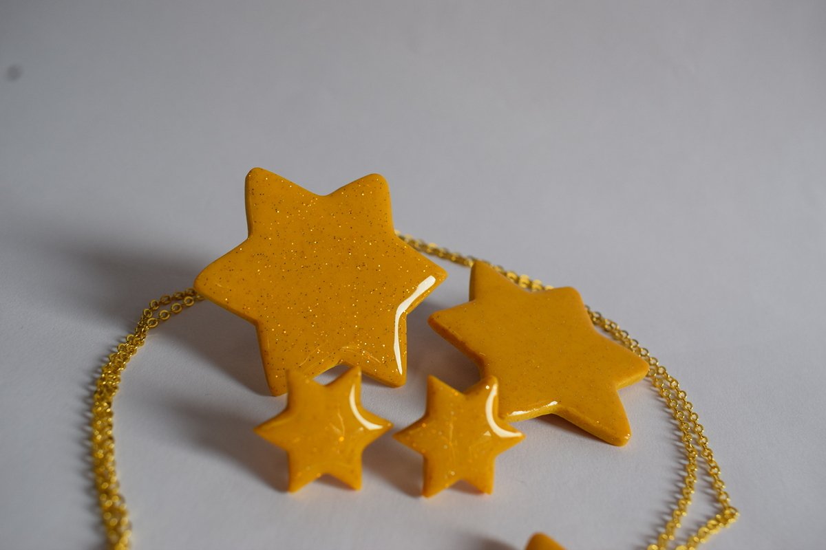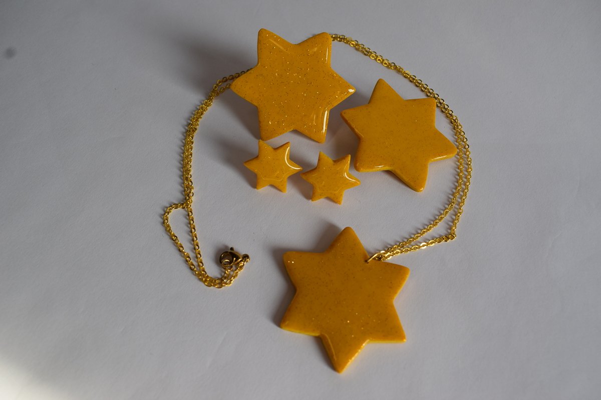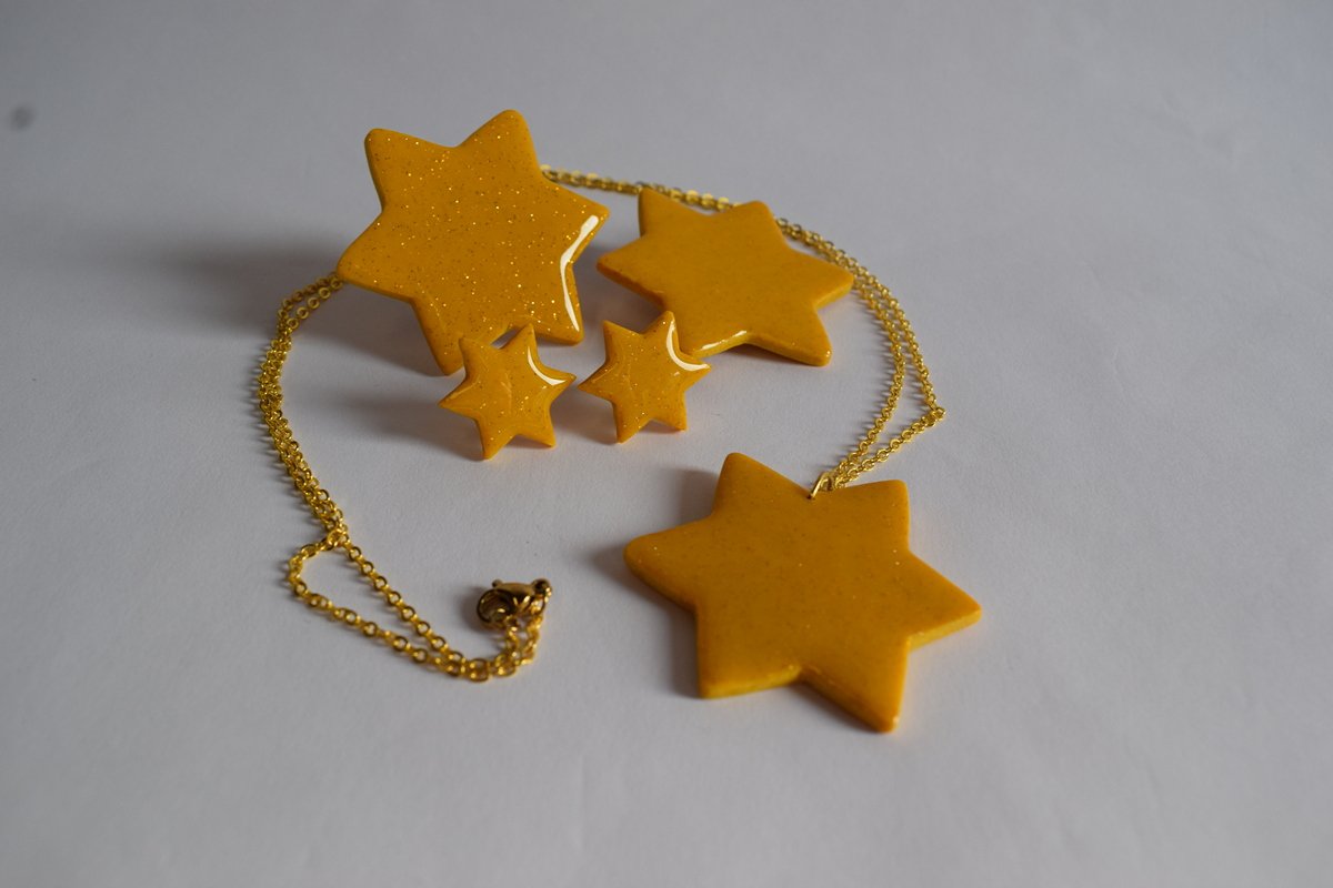 Рачно моделиран сет од епоксидна смола во топла жолта нијанса со фини сјајчиња. Вклучува ѓердан со ѕвезда-привезок на златест синџир, мини ѕвездички пусет-обетки, брош и прилагодлив прстен. Запечено и лакирано за висок сјај и издржливост – разигран, светол акцент за секојдневни комбинации.