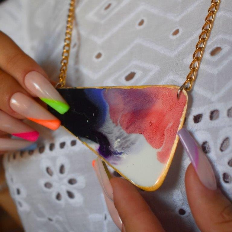 Накитот е изработен од епоксидна смола и метал (механизми за спојување). Накитот е лесен и пријатен за носење. Секое праче е уникатено и изрботено рачно во само еден примерок. Дополнително, нудиме можност за изработка на накит според Ваши насоки.
