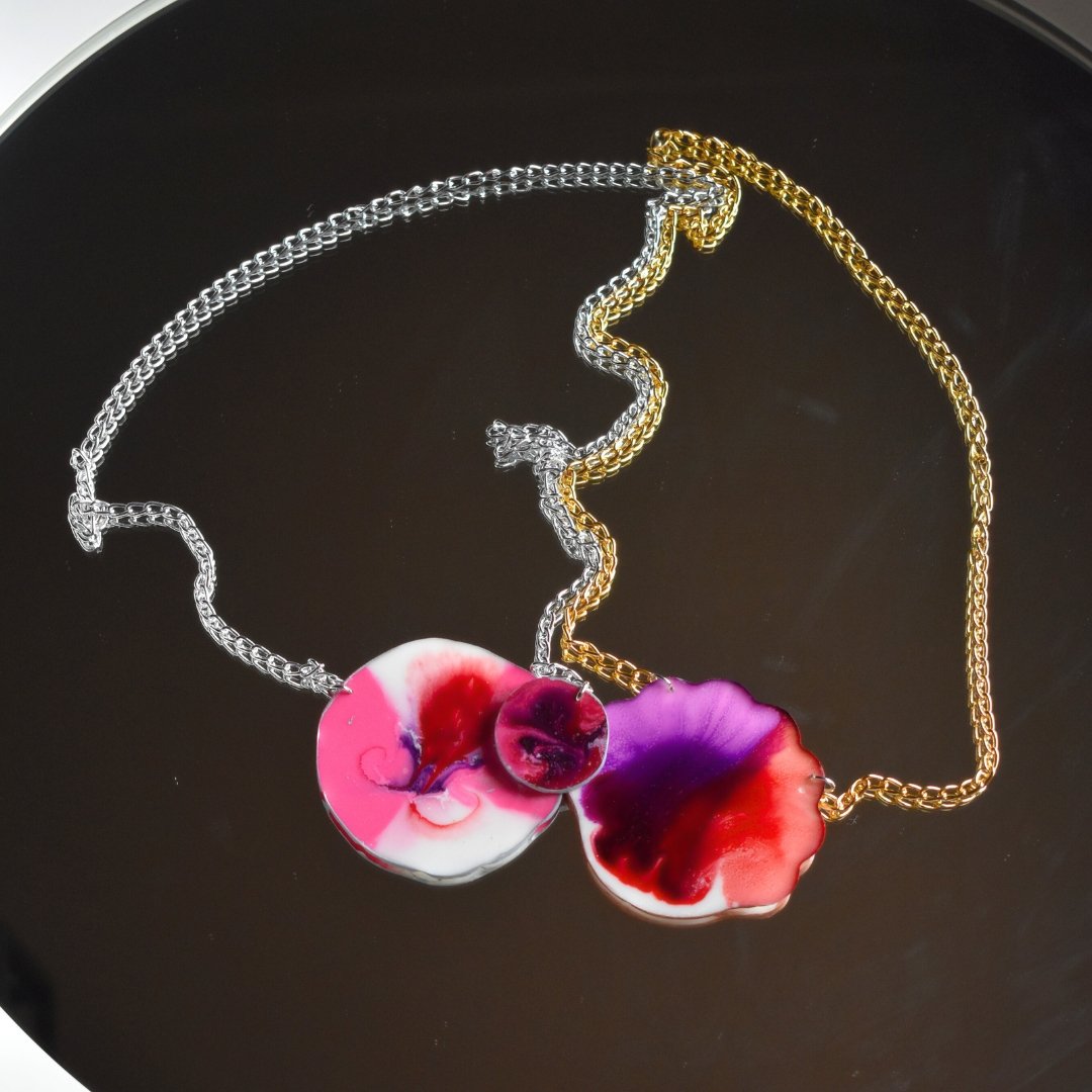 Накитот е изработен од епоксидна смола и метал (механизми за спојување). Накитот е лесен и пријатен за носење. Секое праче е уникатено и изрботено рачно во само еден примерок. Дополнително, нудиме можност за изработка на накит според Ваши насоки.